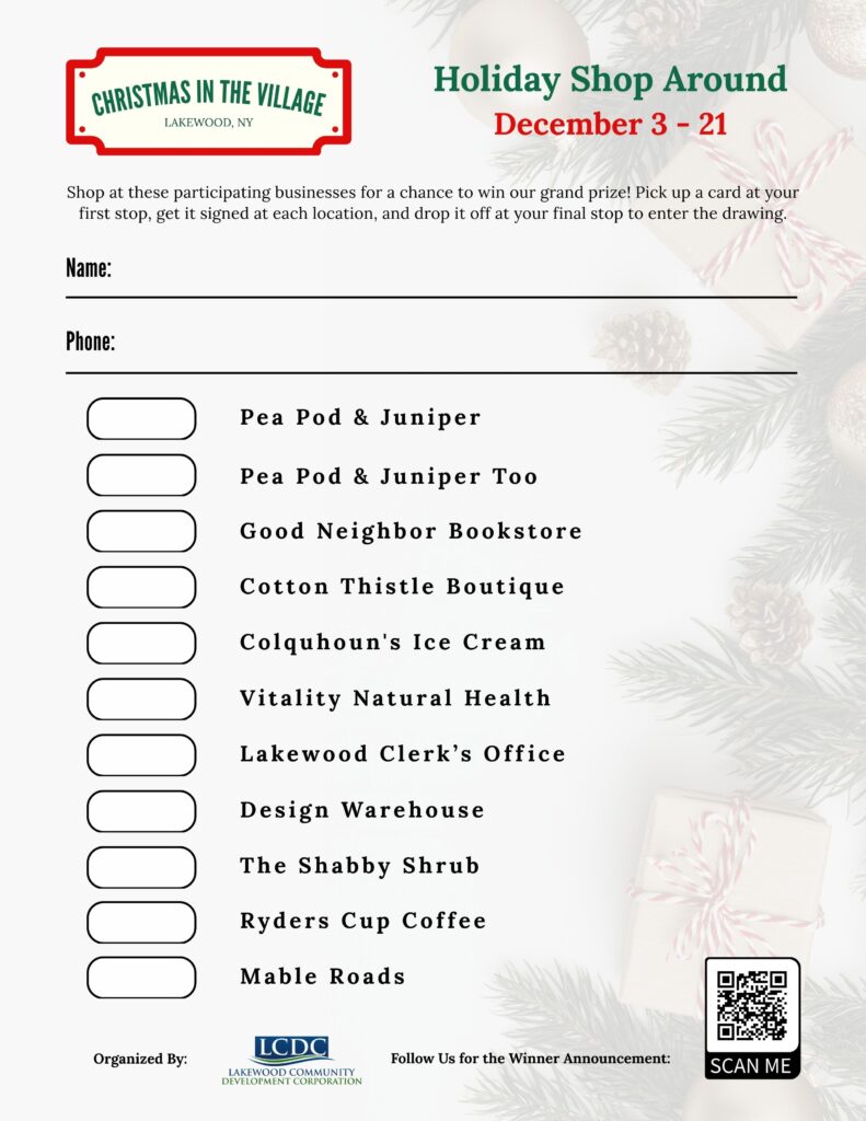 Tour the village on a festive sleigh ride and check off your Christmas list at Lakewood’s local shops along Chautauqua Ave!